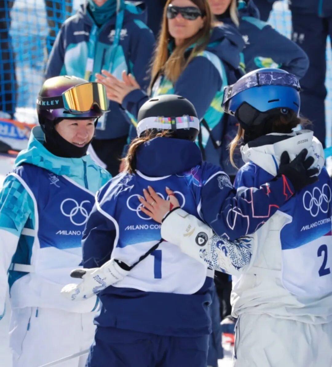 當時谷愛凌的身體明顯傾向另一個運動員,和這次米蘭如出一轍