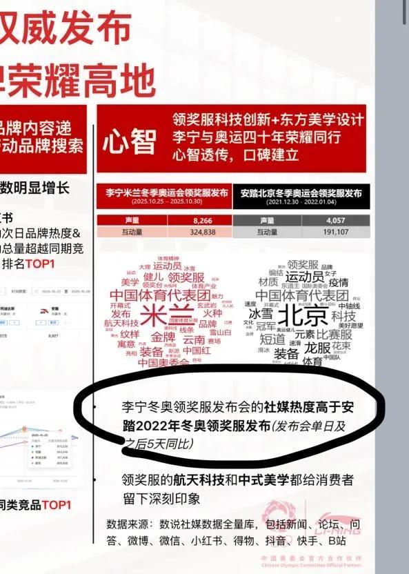 早在去年10月下旬,米蘭冬奧倒計時100天之時,李寧就和中國奧委會發布了中國體育代表團的室外領獎服。在內部的營銷PPT裏有這樣一句話:活動次日,李寧品牌熱度與互動總量超越同期競品,排名TOP1。(小紅書平臺)