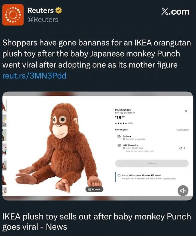 它從中挑選了一隻來自宜家的紅猩猩陪伴自己