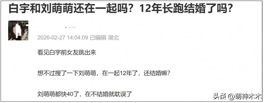 說到白宇的現任劉萌萌,這也是一段超長跑戀情,兩人2013年因戲結緣,之後開啓了低調戀愛模式,至今12年了。此前,有消息稱兩人在2023年訂婚了,在2025年8月,白宇還以劉萌萌親友的身份爲她的劇集包場,似乎感情發展很穩定。不過,在去年年底有分手消息傳出,從兩人2月份的海南IP來看,可能並未分手。