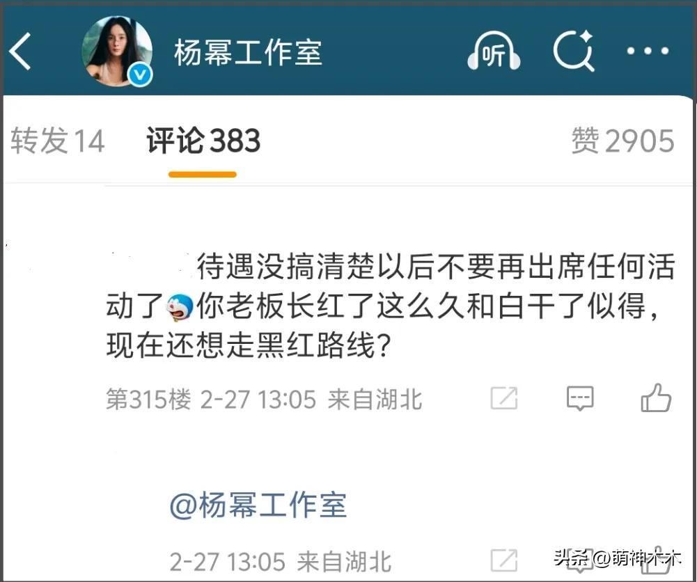 微博之夜座位爭議之後,楊冪又捲入了時裝週待遇風波,目前楊冪工作室賬號評論區已經有留言公開表達不滿,甚至覺得如果楊冪一直搞不清楚待遇,乾脆就不要出席任何活動了,出道三十多年竟然宛若白乾,總不能快40歲了還走黑紅路線吧?