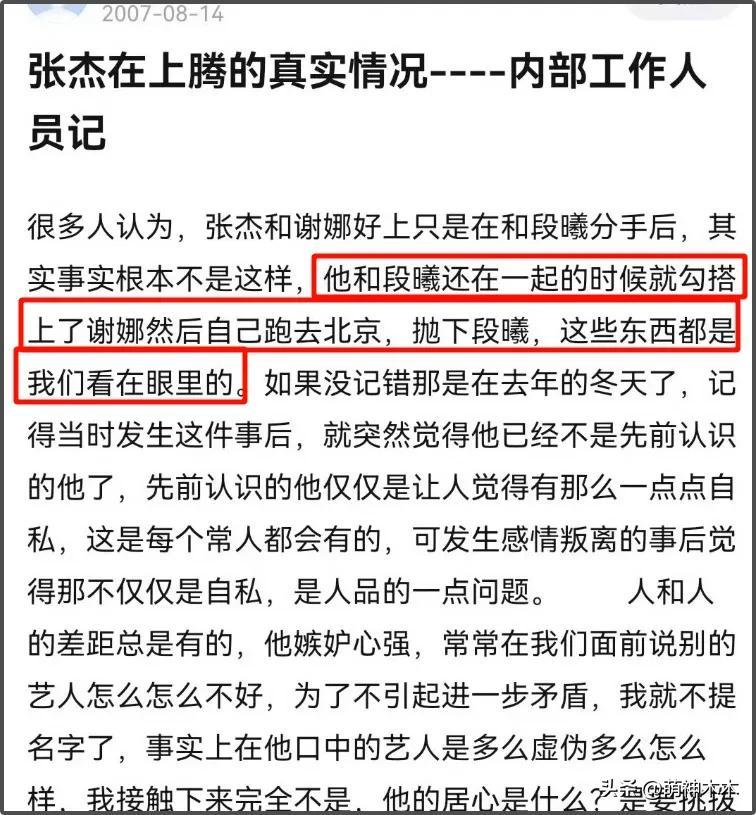 早在07年的時候,就有內部人員爆料,段曦是張傑前女友,張傑在和段曦戀愛的時候,認識謝娜,拋下了段曦,這些工作人員都看在眼裏。還說在段曦之前的一任女友,也是這麼分手的。