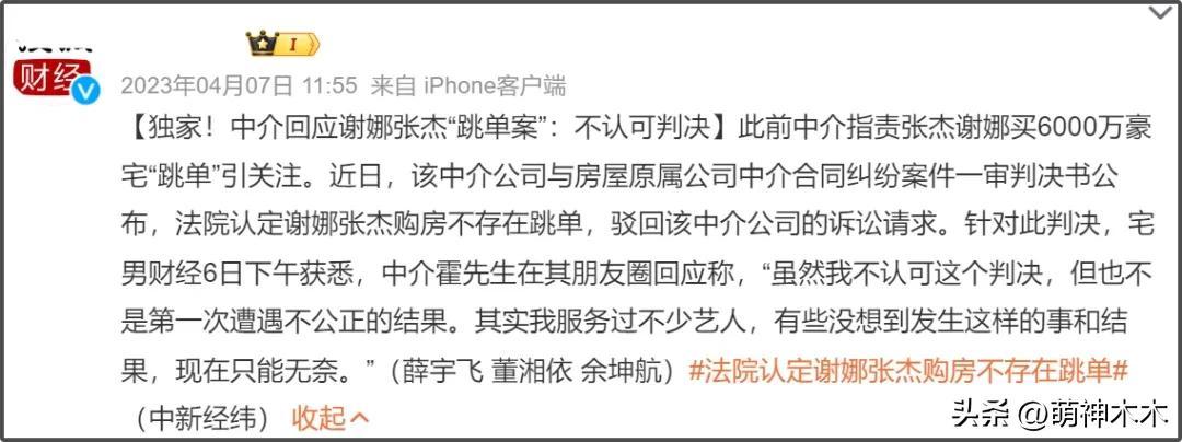 至於買房跳單,當年這件事也有相關報道,不過後續是張傑謝娜勝訴,不過中介則堅稱自己爆料內容屬實,當時這件事也讓張傑和謝娜的口碑再度下滑。
