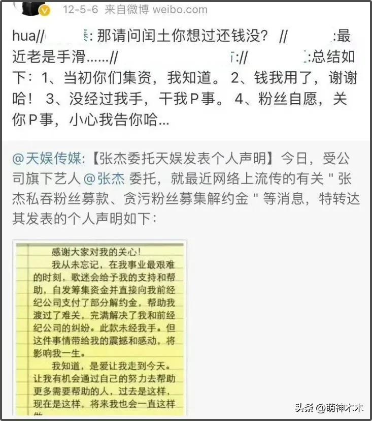 這件事在當年也有報道,甚至傳出剩餘款項不明一事。後續張傑還委託天娛發聲明回應,承認是歌迷幫助他渡過難關,他很感動,但具體款項沒有經過他的手,是否會還款也沒有提及,不過粉絲表示張傑有開免費演唱會。