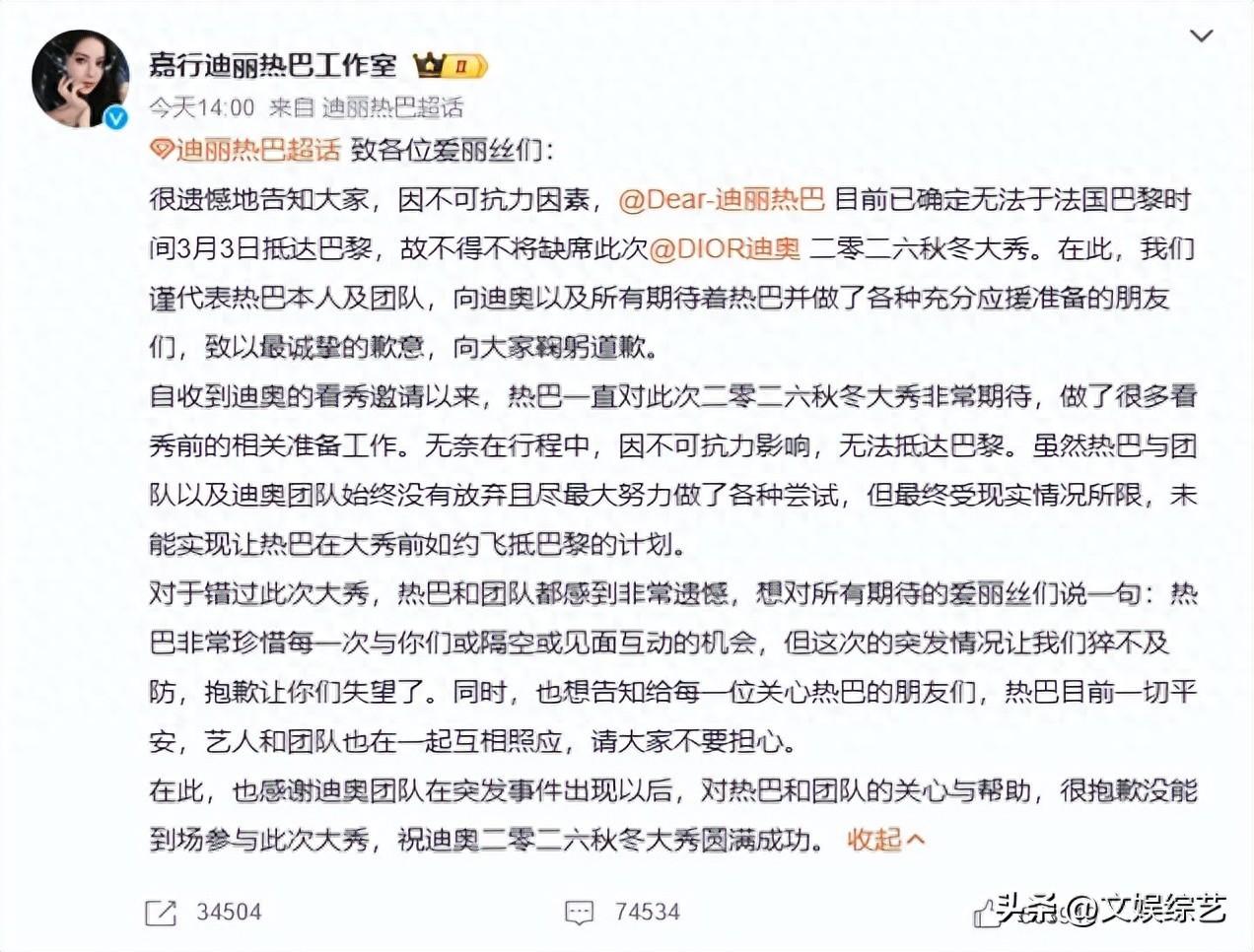 巴黎的秀場燈光已經亮起,DIOR2026秋冬大秀的T臺旁,本該有迪麗熱巴優雅的身影。可迪拜上空突發的戰事,像一陣突兀的狂風,吹亂了所有精心籌備的計劃。