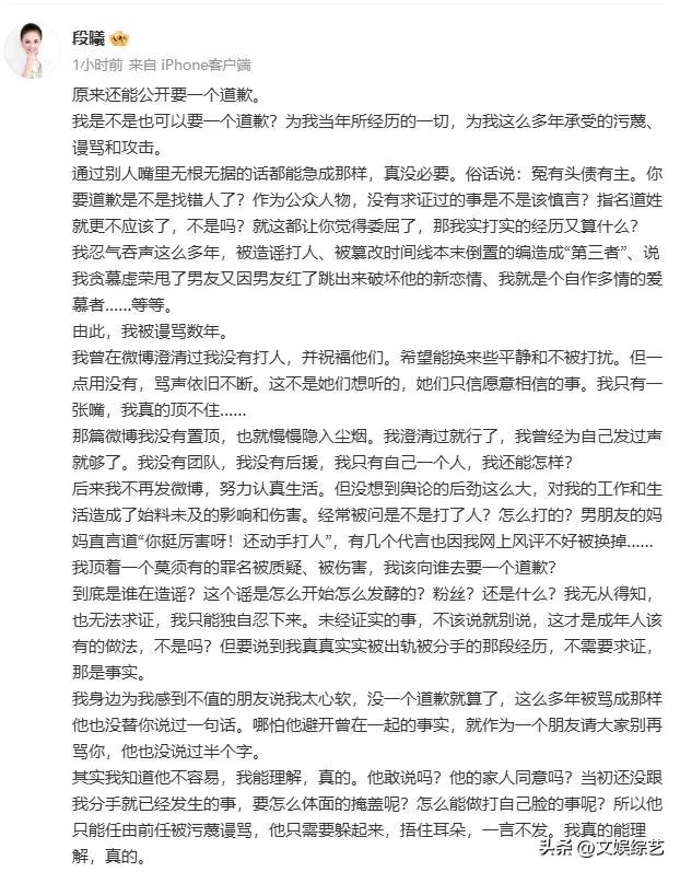 段曦的出現,讓這場風波變得更加撲朔迷離。她曬出當年的聊天記錄,控訴張傑在未分手時就有了“新的選擇”,自己被丟在異地抑鬱輕生;她否認“掌摑謝娜”的謠言,哭訴十餘年的網暴之苦;她力挺薛之謙,說他“養活全公司”“重情重義”,反問謝娜“道聽途說要求道歉是否欠妥”。