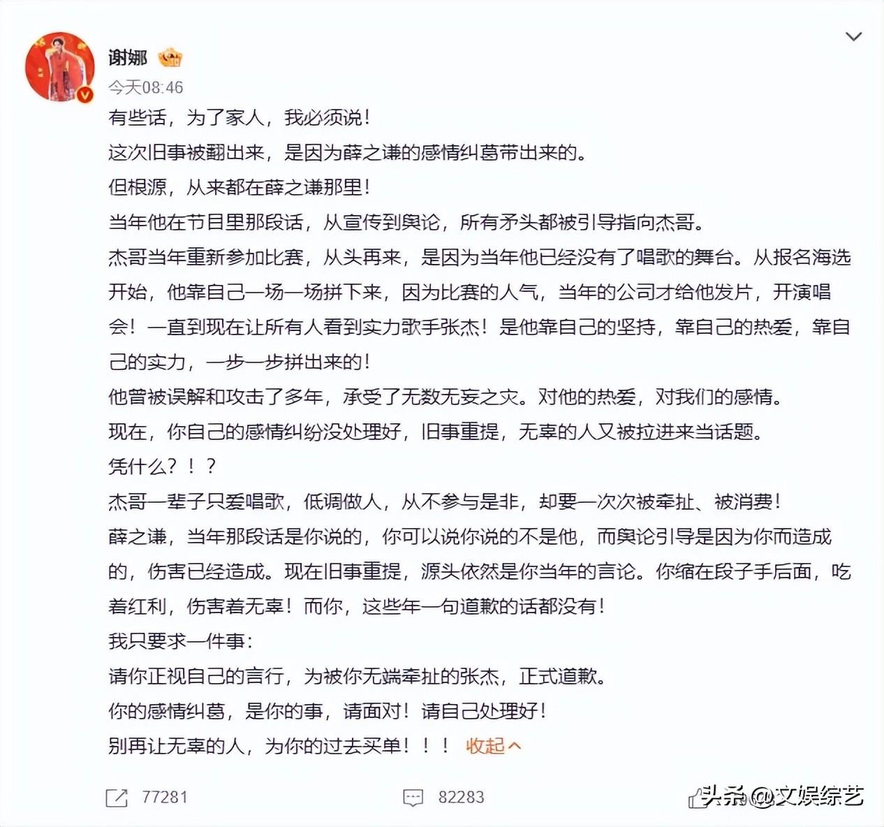 謝娜的憤怒,像一把點燃火藥桶的火柴。她在長文裏字字泣血,控訴薛之謙2017年《吐槽大會》的言論讓張傑被“靠妻子上位”的標籤困擾9年,李雨桐的爆料更是在舊傷上撒鹽。