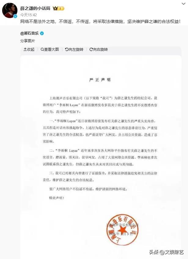 薛之謙的處境,像一個被架在火上烤的人。他的公司發聲明否認李雨桐的指控,說她“多年來多次散佈不實謠言蹭流量”,卻對謝娜的道歉要求避而不談。