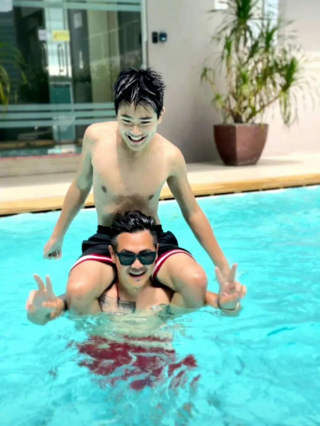 陪爸爸一起游泳,就是這拍照姿勢可以說是很“孝”了