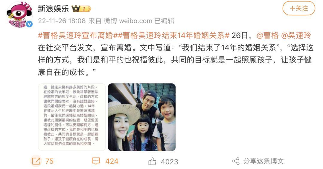 雖然曹格和吳速玲在22年時官宣離婚,卻絲毫沒有影響到孩子的生活,
