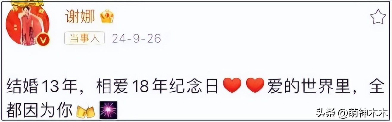 先來看謝娜對這段感情的定義,2024年9月26日,謝娜發文寫下“結婚13年,相愛18年紀念日。”