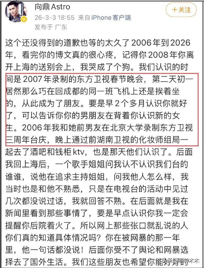段曦和張傑都沒有說具體的分手時間,在段曦的定義裏,張傑出軌。而兩人多年網傳的分手時間線則是2007年,與謝娜認愛也是2007年。此次大亂鬥,力挺段曦的向鼎發文裏透露段曦和張傑至少在2006年年底尚未分手,他後悔沒能早和段曦認識,不然2006年10月份就可以說張傑揹着她認識其他女生的事兒。