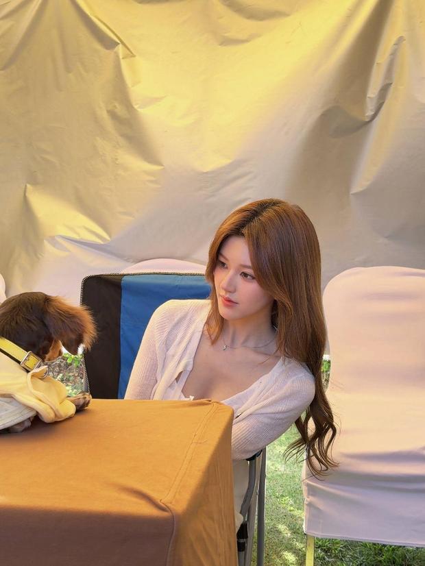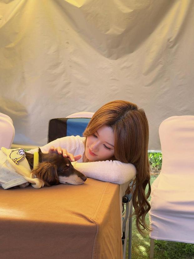 趙露思輕撫桌旁的小狗,溫柔淺笑。