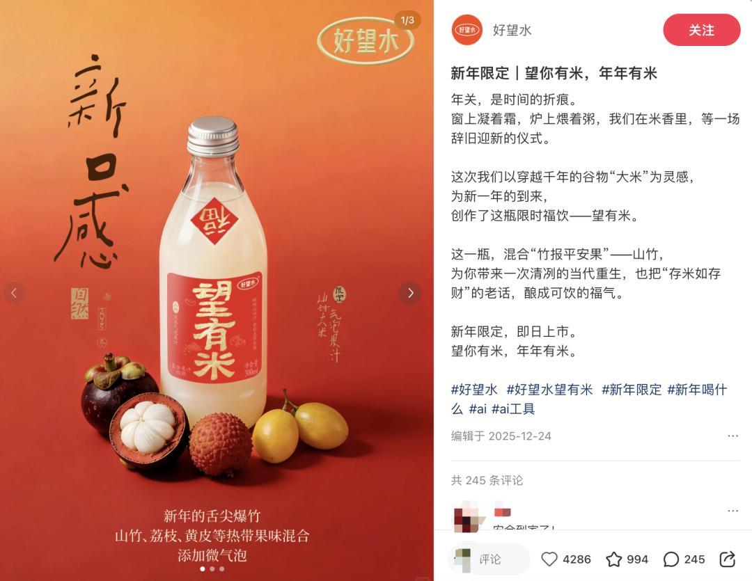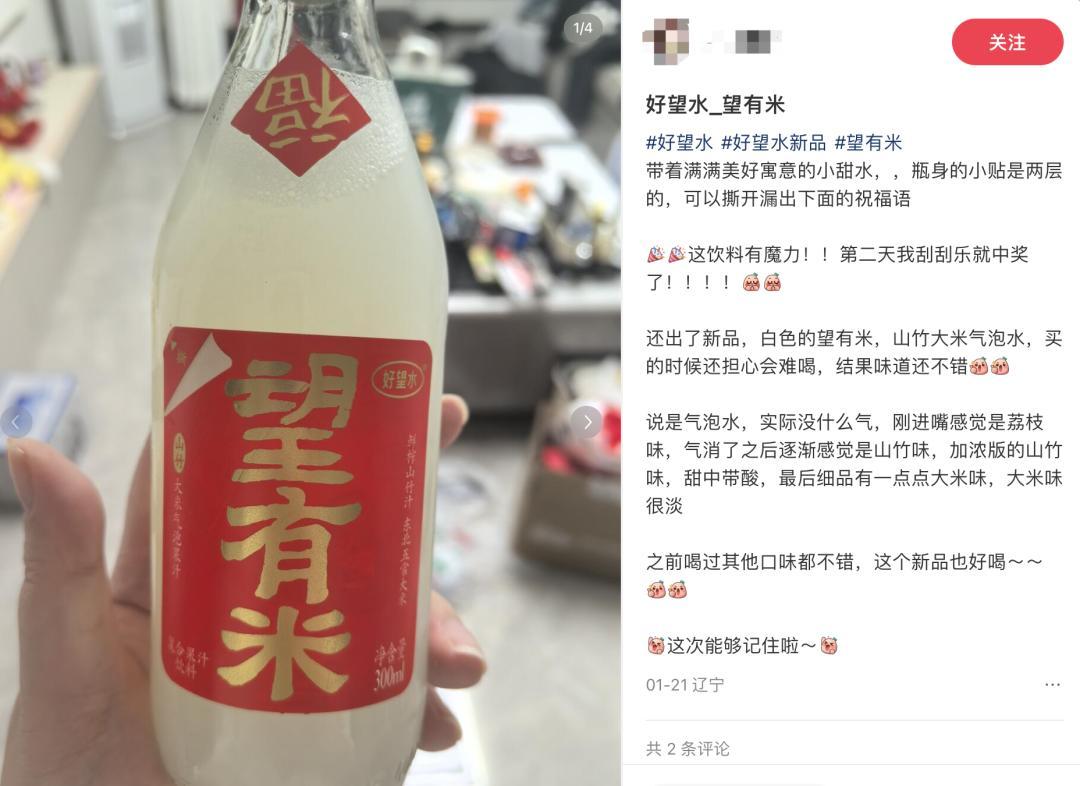 某種程度上,好望水在產品端的創新也能帶來較高的品牌傳播度,例如近期推出的山竹氣泡水“望有米”,獨特的口味和美好寓意,吸引了諸多消費者在社交平臺分享口味、或曬出將瓶子作爲裝飾品的家居圖。