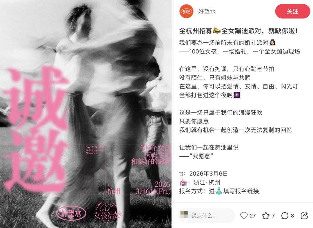 臨近三八,好望水發起“100個女孩結婚”的全女蹦迪派對,這也是好望水持續在做的一個線下活動,核心是以線下市集/活動+女性分享的方式,創造與女性用戶有效對話的場景。