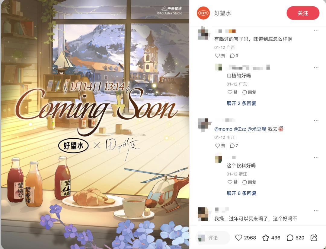 近期,好望水還與小說IP《囚於永夜》合作,這也是《囚於永夜》的首次品牌聯名,官宣之初就吸引了大量粉絲蹲守,合作期間粉絲們紛紛下單、曬卡。此前好望水還與戀與製作人、凹凸世界等圈層IP合作,均取得不錯的效果。