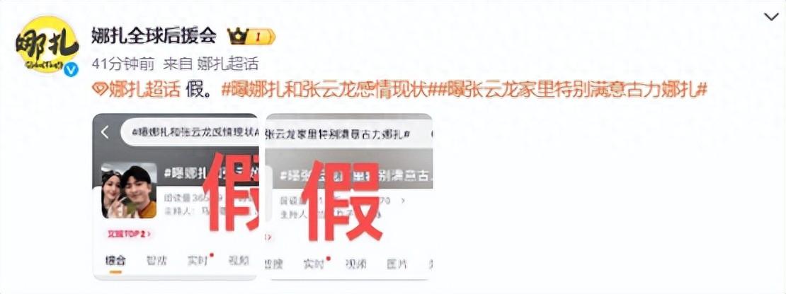 對此,娜扎全球后援會在社交平臺發文闢謠:“假”。