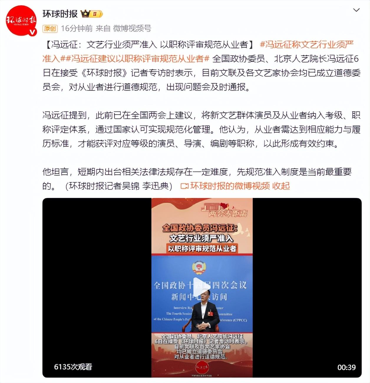 馮遠征提到,此前已在全國兩會上建議,將新文藝羣體演員及從業者納入考級、職稱評定體系,通過國家認可實現規範化管理。他認爲,從業者需達到相應能力與履歷標準,才能獲評對應等級的演員、導演、編劇等職稱,以此形成有效約束。