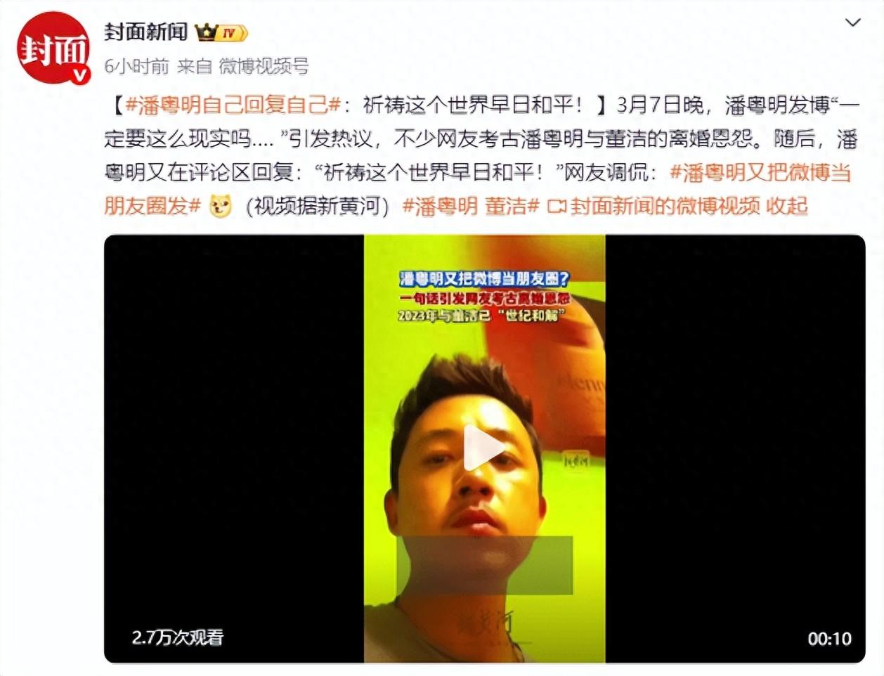 3月7日晚,潘粵明發博“一定要這麼現實嗎…. ”引發熱議,不少網友考古潘粵明與董潔的離婚恩怨。隨後,潘粵明又在評論區回覆:“祈禱這個世界早日和平!”