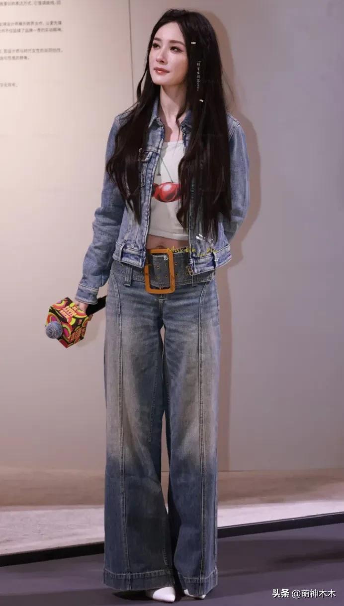 而全身造型,楊冪的搭配也有些過時,上裝是牛仔外套搭露臍白T,下裝是高腰闊腿褲搭尖頭高跟鞋,按道理來說這一套不會出大錯。但或許可能真的是造型與年齡不適配,從頭到腳都很奇怪,頭髮搭在肩上顯得很厚重累贅,闊腿褲的寬腰帶特別浮誇,沒有顯出復古的氣質,就是很土,還有一種硬湊的違和感。