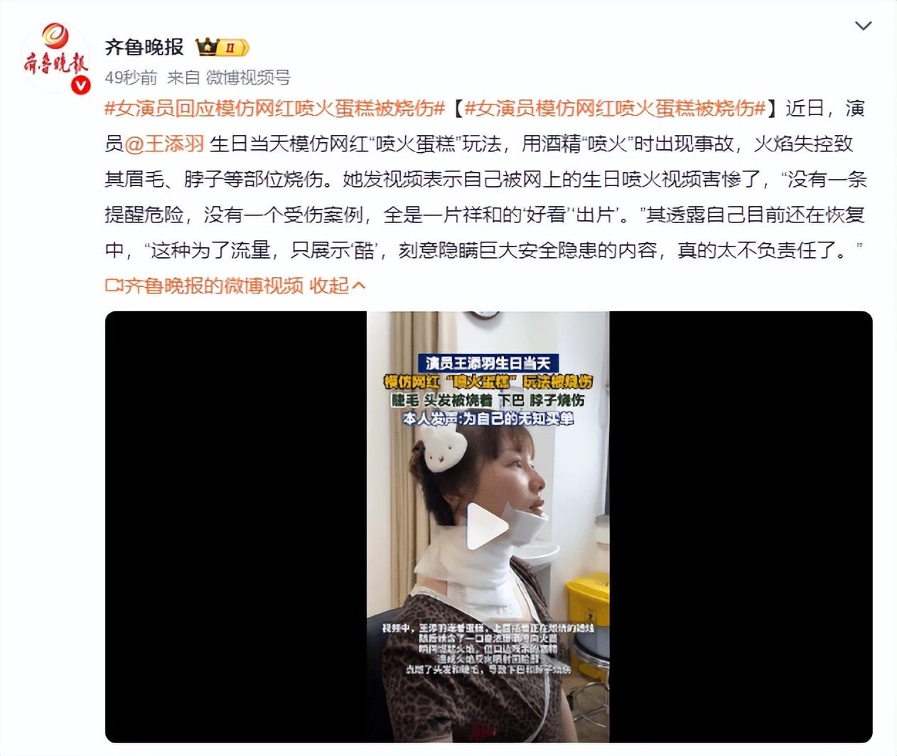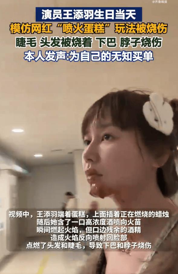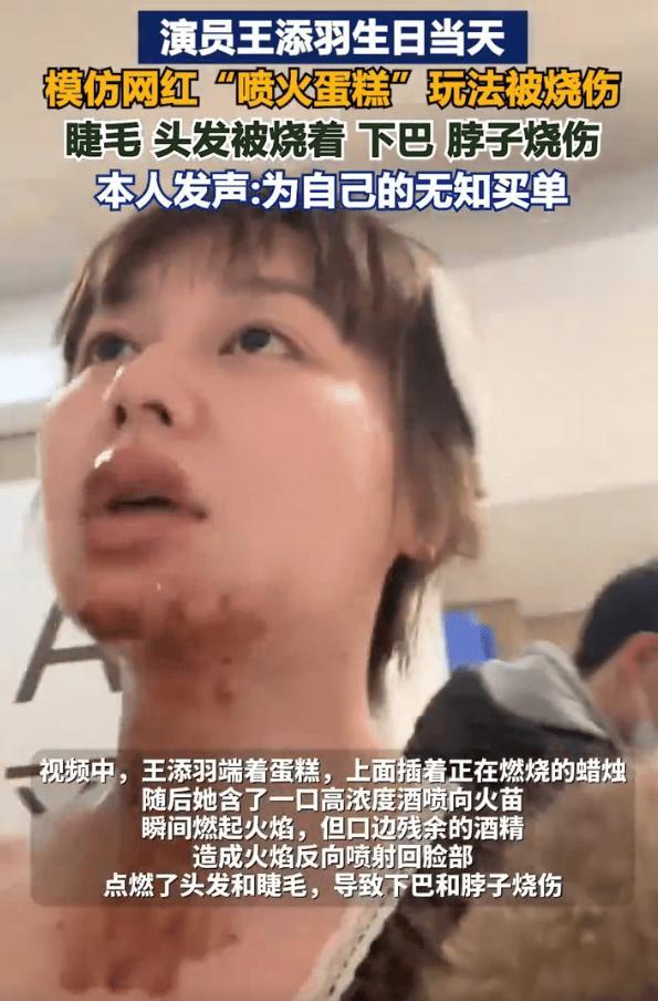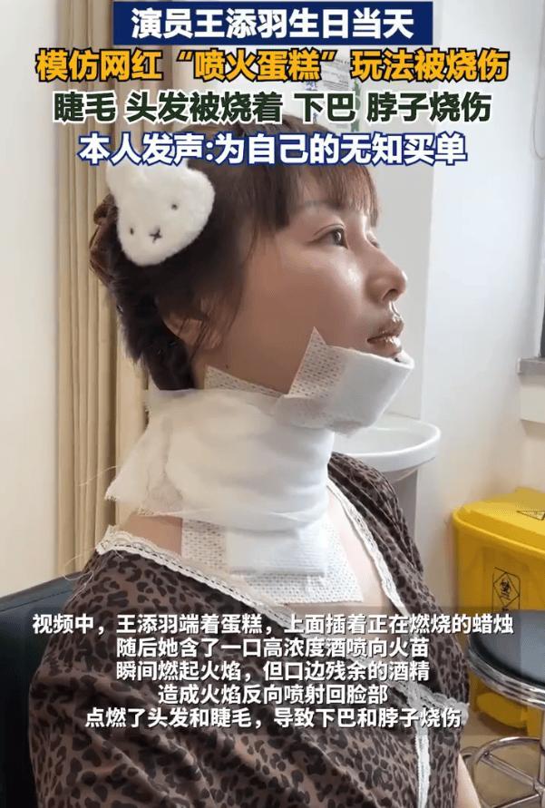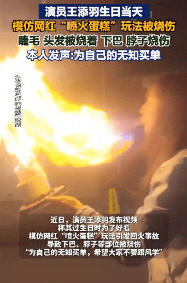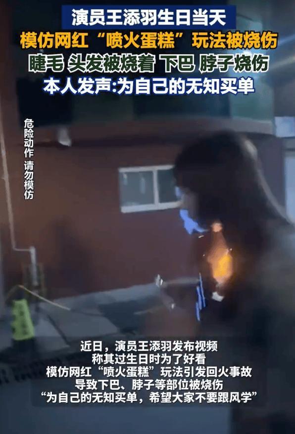 近日,演員王添羽生日當天模仿網紅“噴火蛋糕”玩法,用酒精“噴火”時出現事故,火焰失控致其眉毛、脖子等部位燒傷。她發視頻表示自己被網上的生日噴火視頻害慘了,“沒有一條提醒危險,沒有一個受傷案例,全是一片祥和的‘好看’‘出片’。”其透露自己目前還在恢復中,“這種爲了流量,只展示‘酷’,刻意隱瞞巨大安全隱患的內容,真的太不負責任了。”