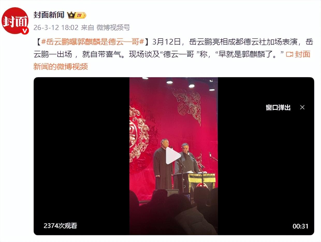3月12日,岳雲鵬亮相成都德雲社加場表演,岳雲鵬一出場 ,就自帶喜氣。他現場談及“德雲一哥”稱,“早就是郭麒麟了。”