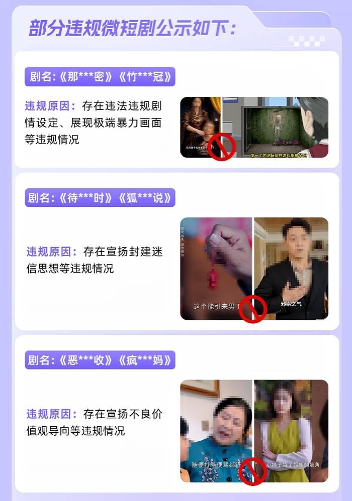 快手也持續強化對違規微短劇的審查巡檢及違規微短劇賬號的管理教育,依照網絡視聽管理相關要求及社區規則,累計前置攔截、整改、下架違規微短劇近百部,並處置了一批違規賬號。
