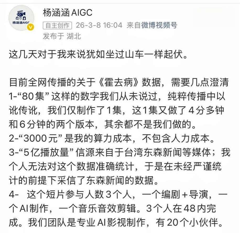 根據楊涵涵介紹,3000元的成本僅僅是算力成本,不包含人力成本等其他成本;團隊也並非網傳的3人,而是將近20人;此外,也不存在80集的《霍去病》短劇,只有兩支4分多鐘和6分多鐘的短片。