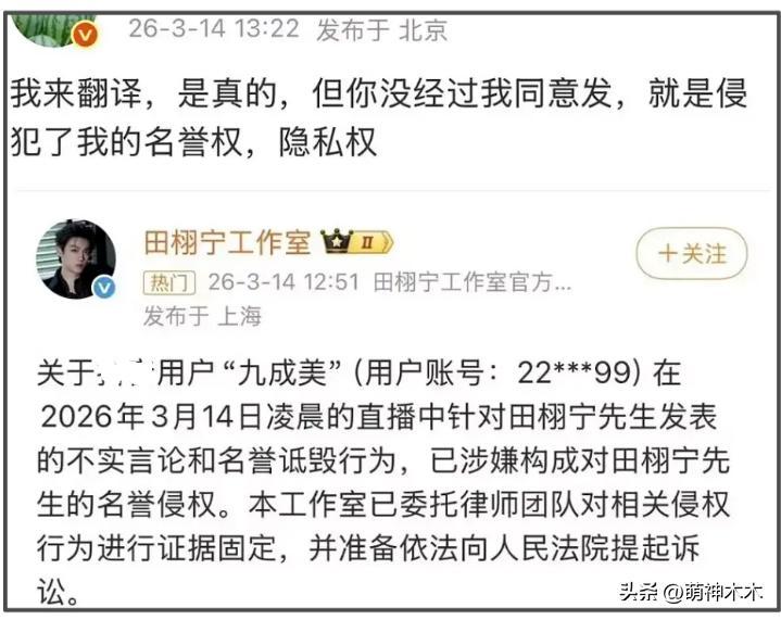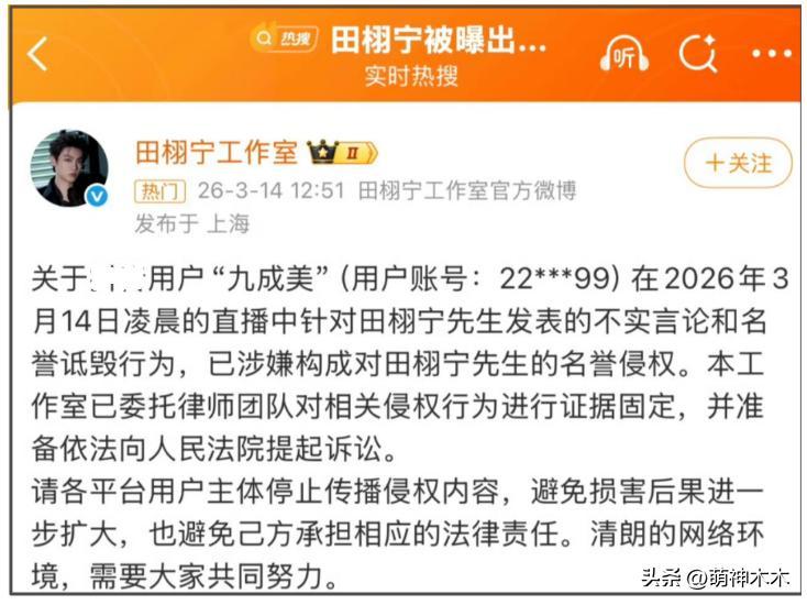 田栩寧工作室發佈聲明,也都是針對第一波錘,開篇就指出直播中言論不實,還是起訴的名譽權。