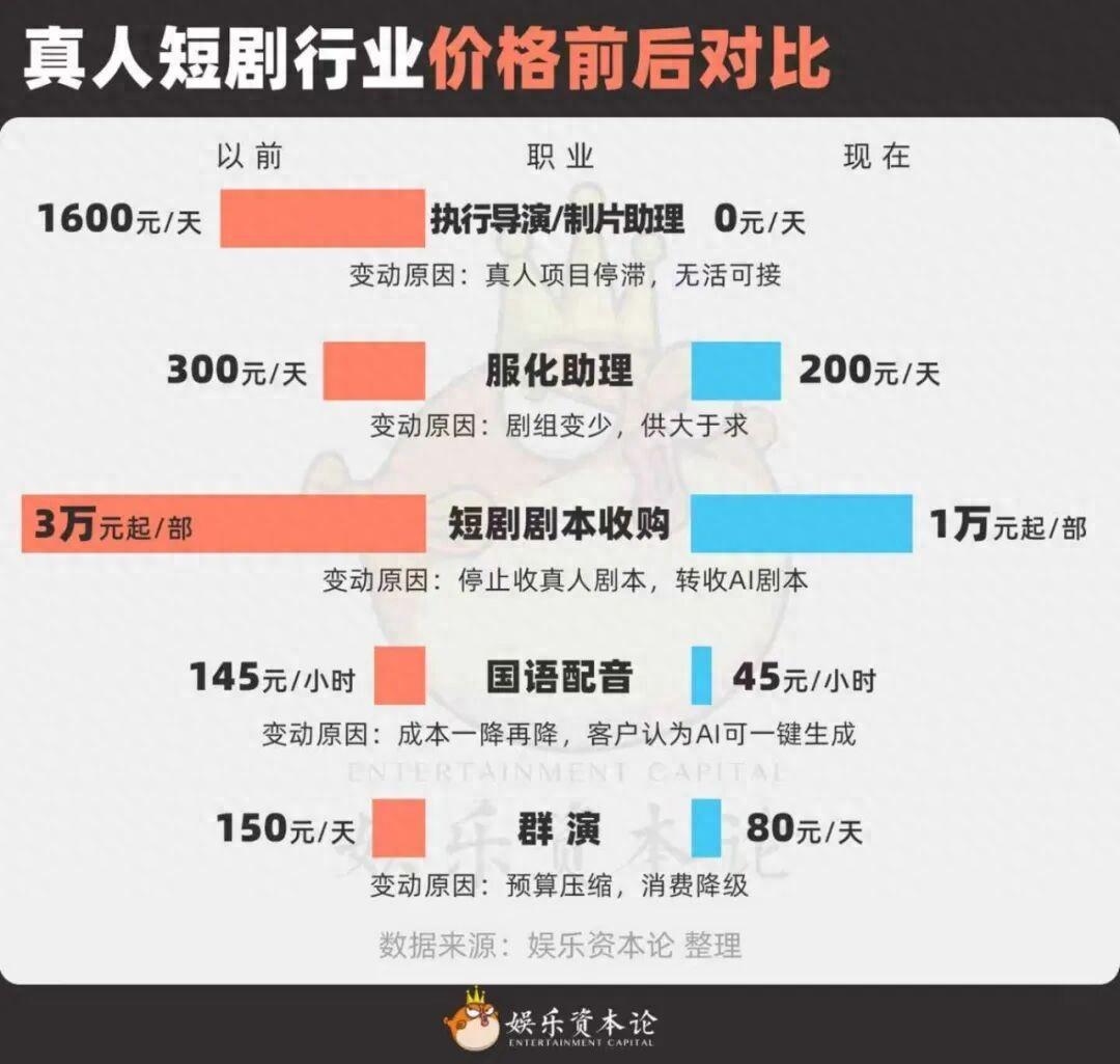 更殘酷的是,編劇的劇本收購價從3萬元跌到1萬元,配音價格從140元/小時被壓到45元,就連羣演日薪也從150元腰斬至80元。這場由AI掀起的行業風暴,正以驚人的速度,捲走真金白銀,也捲走無數人的飯碗。