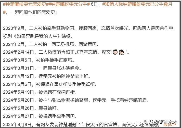 再來就是和33歲女星鍾楚曦的戀情了,二人2023年被拍,2024年官宣,2025年分手,戀愛時間不算長,但網友的爆料剛剛好發生在兩年時間內。