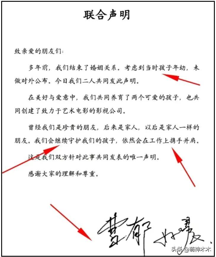 明面上,姚晨和前夫曹鬱都保持了體面,二人聯合發佈聲明,寫上手寫簽名,強調雙方婚姻結束多年,因爲孩子年幼纔沒公佈,未來還會一起撫養孩子,還要繼續一起開公司,打拼影視事業。