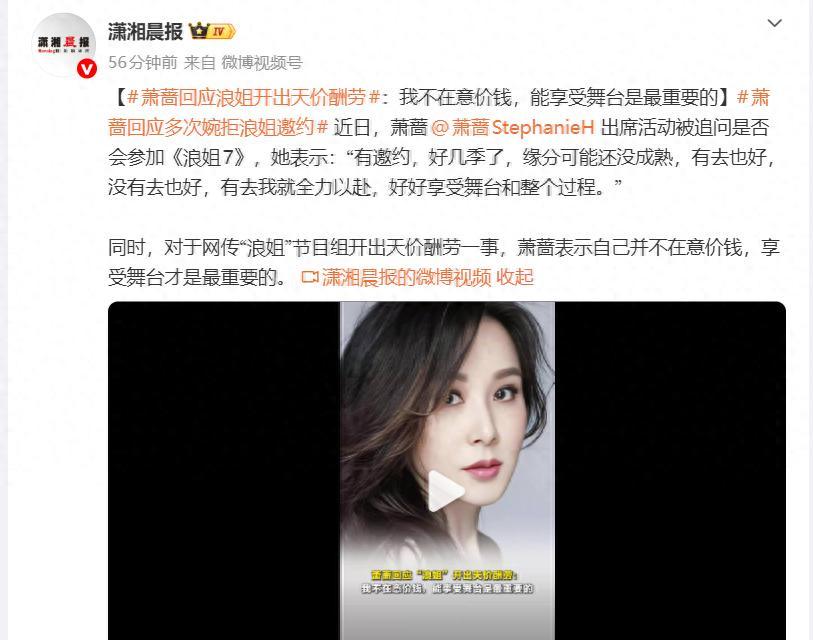 近日,蕭薔出席活動被追問是否會參加《浪姐7》,她表示:“有邀約,好幾季了,緣分可能還沒成熟,有去也好,沒有去也好,有去我就全力以赴,好好享受舞臺和整個過程。”同時,對於網傳“浪姐”節目組開出天價酬勞一事,蕭薔表示自己並不在意價錢,享受舞臺纔是最重要的。
