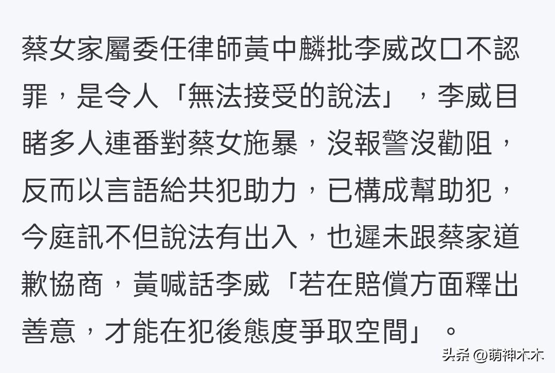回顧李威與受害者家屬的態度,也發現關鍵點是合理賠償。在去年的庭審中,李威在轉爲污點證人後當庭表示不認罪,稱鼓勵蔡女士“勇敢道歉就沒事”是出於同情,無傷害意圖,而且自己是在事件發生後才被動加入羣組。當時受害者家屬委託律師還在庭上批評李威的翻供讓人無法接受,家屬表示該案發一年多來沒有接到任何被告一句道歉,甚至公開催促李威積極談賠償,才能爭取寬容。