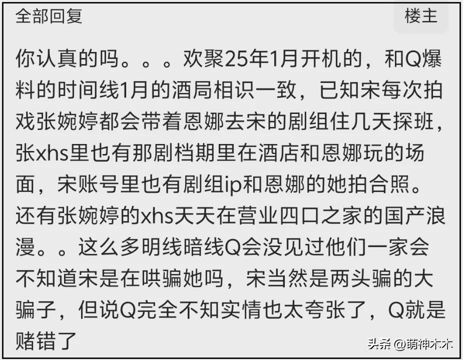 根據網友扒出的時間線,宋寧峯2025年進了一個名爲《歡聚》的劇組,和高露飾演一對夫妻,作爲高露的助理,Q女士也在。《歡聚》是2025年1月份在浙江開機,也就是說宋寧峯剛進組就盯上了別人家20多歲的女助理(Q女士)。