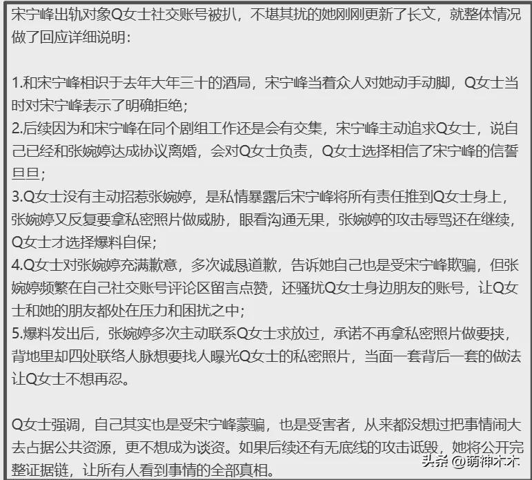 總結一下Q女士回應重點,她強調宋寧峯在大年三十酒局先動手動腳,自己明確拒絕了,二人在同一個劇組工作,被拒絕的宋寧峯不肯放棄,透露和張婉婷簽了離婚協議,會對她負責,Q女士才選擇相信。