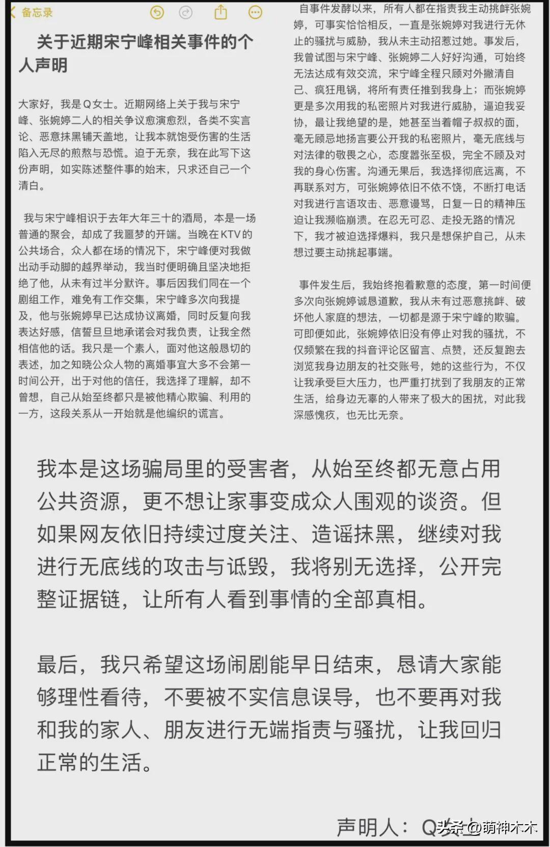 隨着男星宋寧峯承認出軌並無限期暫停演藝工作,鬧得沸沸揚揚的美女明星收割機出軌風波似乎就此完結,然而等到網友扒出小三Q女士的社媒,整件事就複雜了起來,最新進展爲Q女士真實身份曝光,她本人也發文回應了。