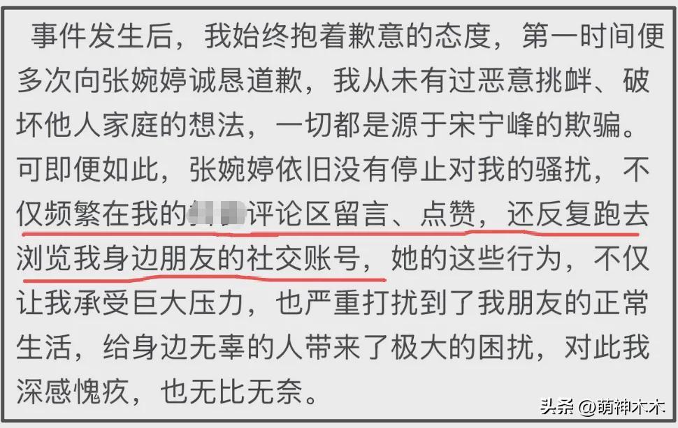 只不過比起宋寧峯,Q女士明顯對宋寧峯妻子張婉婷更有情緒,強調自己和張婉婷多次道歉,但張婉婷還是不肯放過她,一邊用曝光私密照片威脅,一邊去Q女士社媒點贊留言,還會瀏覽Q女士朋友賬號。