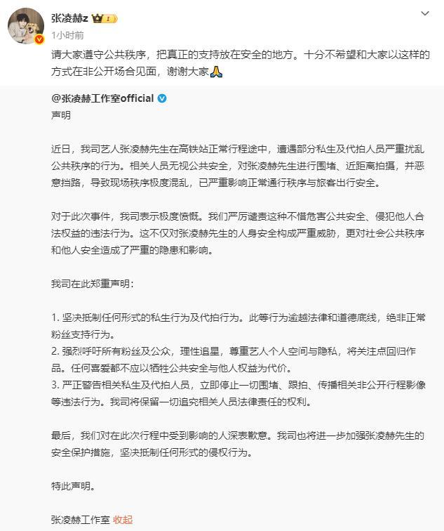 張凌赫工作室發佈嚴正聲明,嚴厲譴責這種不惜危害公共安全、侵犯他人合法權益的違法行爲。“這不僅對張凌赫的人身安全構成嚴重威脅,更對社會公共秩序和他人安全造成了嚴重的隱患和影響。”