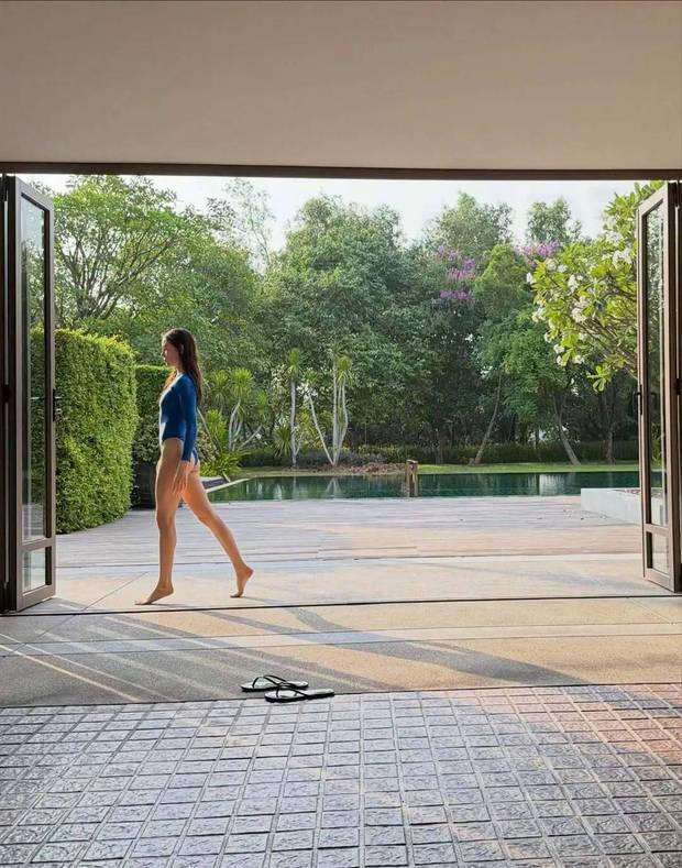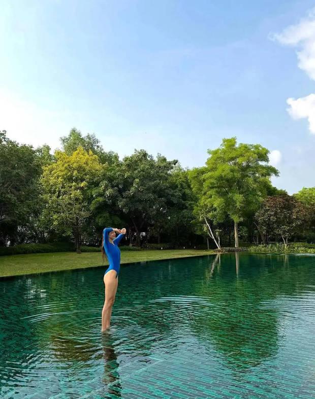 谷愛凌穿藍色泳裝秀美腿。