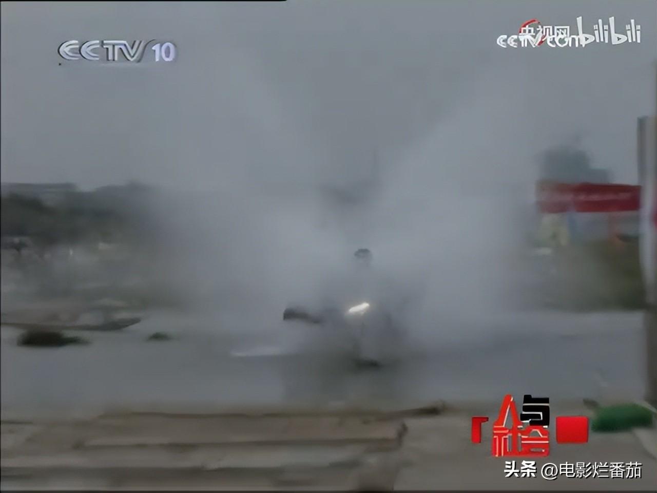 11點30分,張雪駕着他改裝的這輛摩托車一躍而下。他需要漂行26米到達河的對岸,纔算挑戰成功,但在距離河岸還有10米的地方,摩托車卻重重摔倒了。
