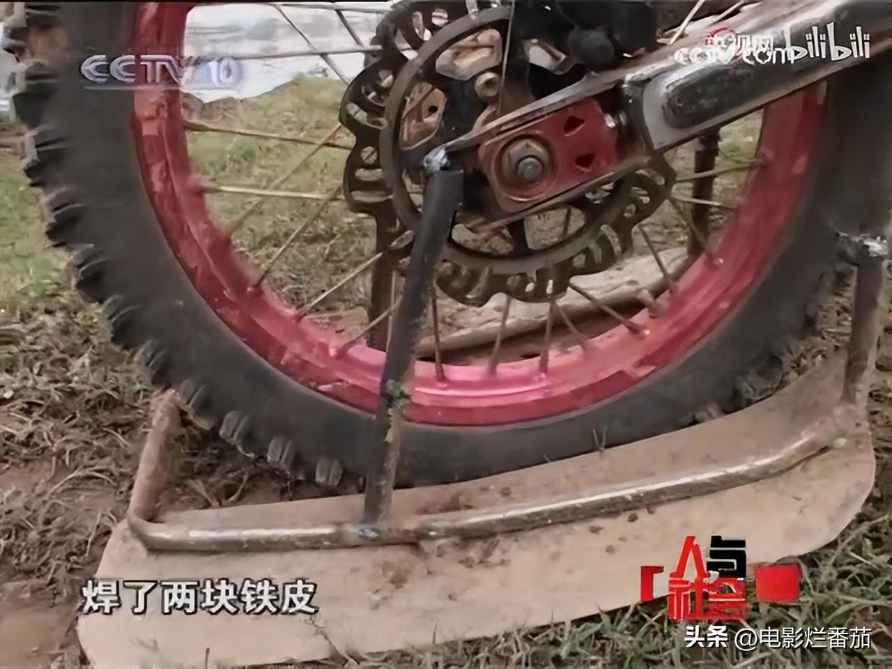 張雪的摩托車的改裝非常有創意,他在車輪上焊接了兩塊鐵皮作爲漂行時的滑水板。