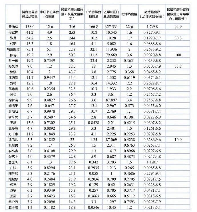 微博初舞臺播放量、直拍播放量等核心數據裏,曾沛慈同樣全面領跑,微博熱度值22.6也斷層領先,真正實現了全平臺無死角的人氣碾壓。