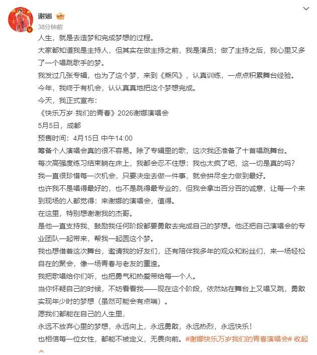 當晚,謝娜還在社交平臺上髮長文官宣演唱會,她表示:“人生,就是去造夢和完成夢想的過程。大家都知道我是主持人,但其實在做主持之前,我是演員;做了主持之後,我心裏又多了一個唱跳歌手的夢。我發過幾張專輯,也爲了這個夢,來到《乘風》,認真訓練,一點點積累舞臺經驗。今年,我終於有機會,認認真真地把這個夢想完成。”
