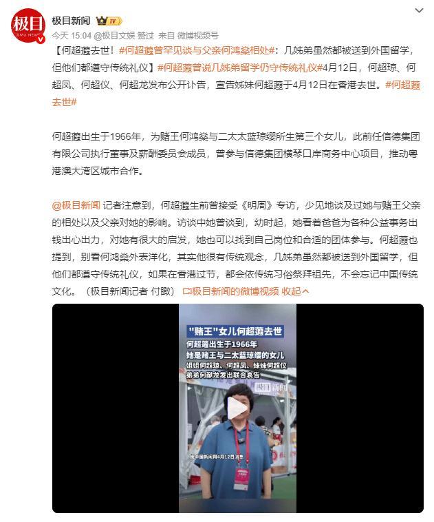 極目新聞記者注意到,何超蕸生前曾接受《明周》專訪,少見地談及過她與賭王父親的相處以及父親對她的影響。訪談中她曾談到,幼時起,她看着爸爸爲各種公益事務出錢出心出力,對她有很大的啓發,她也可以找到自己崗位和合適的團體參與。何超蕸也提到,別看何鴻燊外表洋化,其實他很有傳統觀念,幾姊弟雖然都被送到外國留學,但他們都遵守傳統禮儀,如果在香港過節,都會依傳統習俗祭拜祖先,不會忘記中國傳統文化。