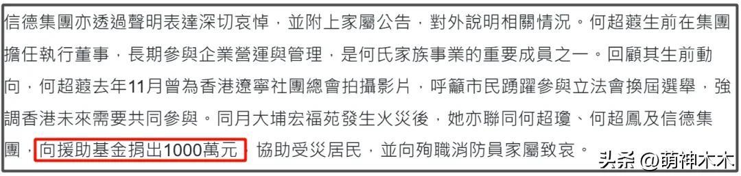 何超蕸也承繼父志,致力於慈善事業,此前的香港火災,信德集團也捐出一千萬救災,善舉非常多。不過何超蕸一生未婚未育,專注於協助姐姐們管理企業,姐妹感情也是很好。