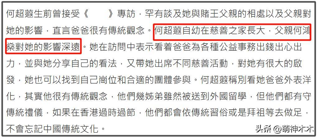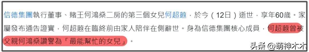 沒想到,賭王去世不到6年,女兒何超蕸就跟隨他而去。在此之前,何超蕸在何家算是最低調的一個子女。一直以來,賭王家族幾乎各個都活躍在聚光燈下,全家時不時還要一起出席個活動,但何超蕸幾乎從未參與亮相。