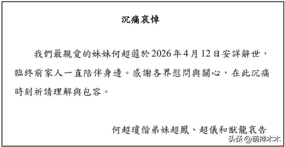 4月12日,港媒報道賭王女兒何超蕸去世,享年60歲。何超瓊和弟弟妹妹一同發佈訃告,宣佈妹妹離世,提到臨終前家人一直陪伴在身邊。