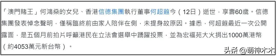 只能說人生無常,何超蕸的離世似乎又把賭王家族的“面紗”揭下一角,原來豪門不是都要博名聲博出彩,也有人默默無聲低調做事。最後就祝福何超蕸一路走好!