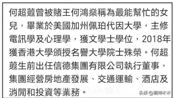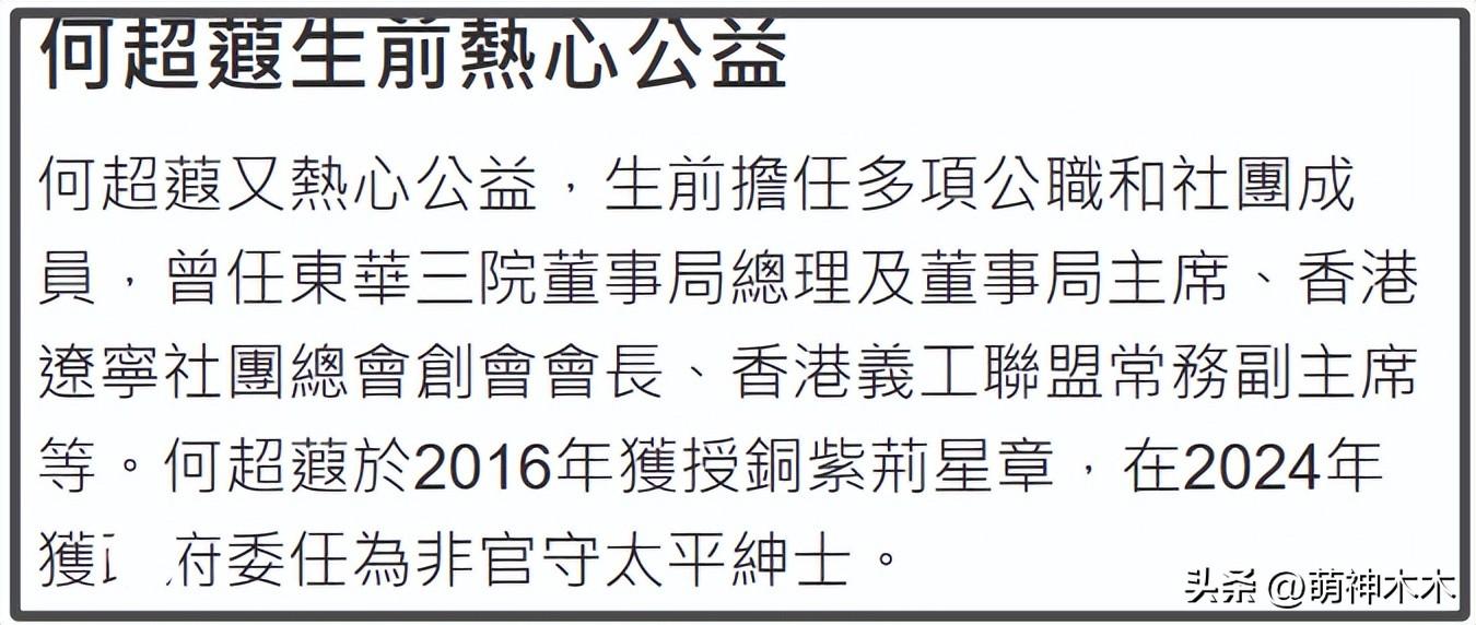 何超蕸生前擔任信德集團執行總裁,而信德集團正是賭王三大核心資產之一,除此之外,何超蕸還是宏海控股的執行董事及主席、香港中商會的會董。還曾在2016年被授予銅紫荊星章,別看她低調,但身上的榮譽可一點也不少。
